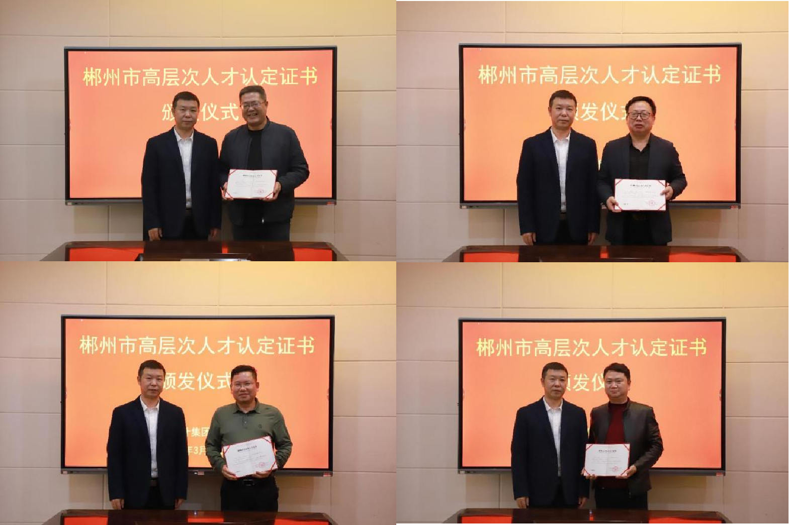 3月25日,郴州市国资委党委书记、主任侯志武前往市设计集团为4名专家颁发郴州市高级人才证书。
